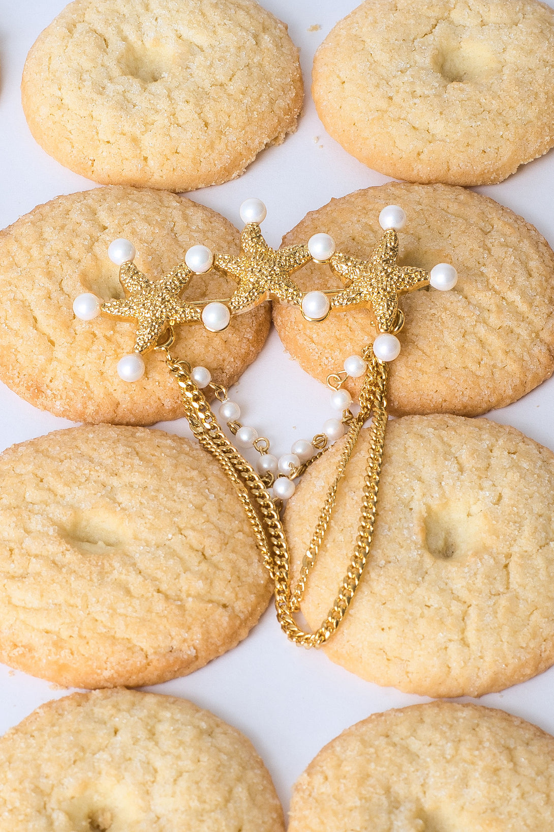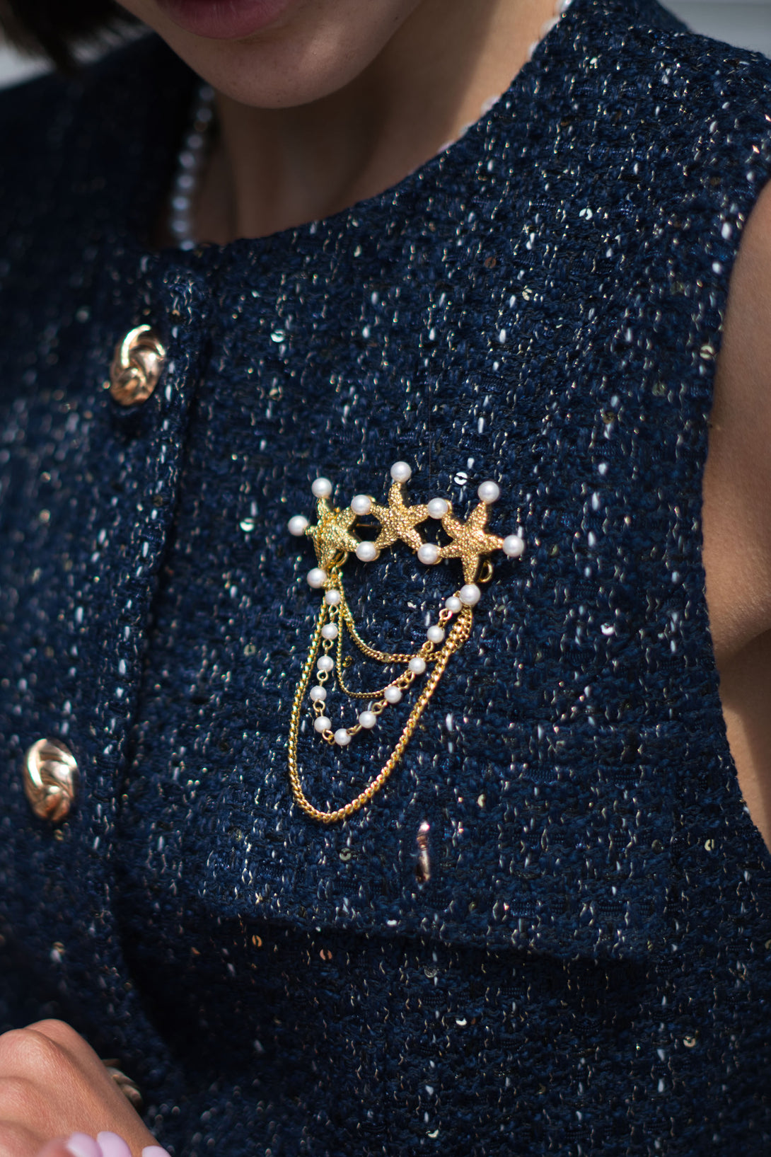 Graceful gold chains, adorned with tiny pearls, cascade down like gentle ocean currents, creating a dynamic and eye catching waterfall effect. Exceptionally versatile, the chains are removable, allowing you to wear the brooch solo or with cascading elegance. Whether pinned to a lapel, scarf, or evening gown, this brooch brings a splash of seaside charm and sophisticated style to any ensemble.